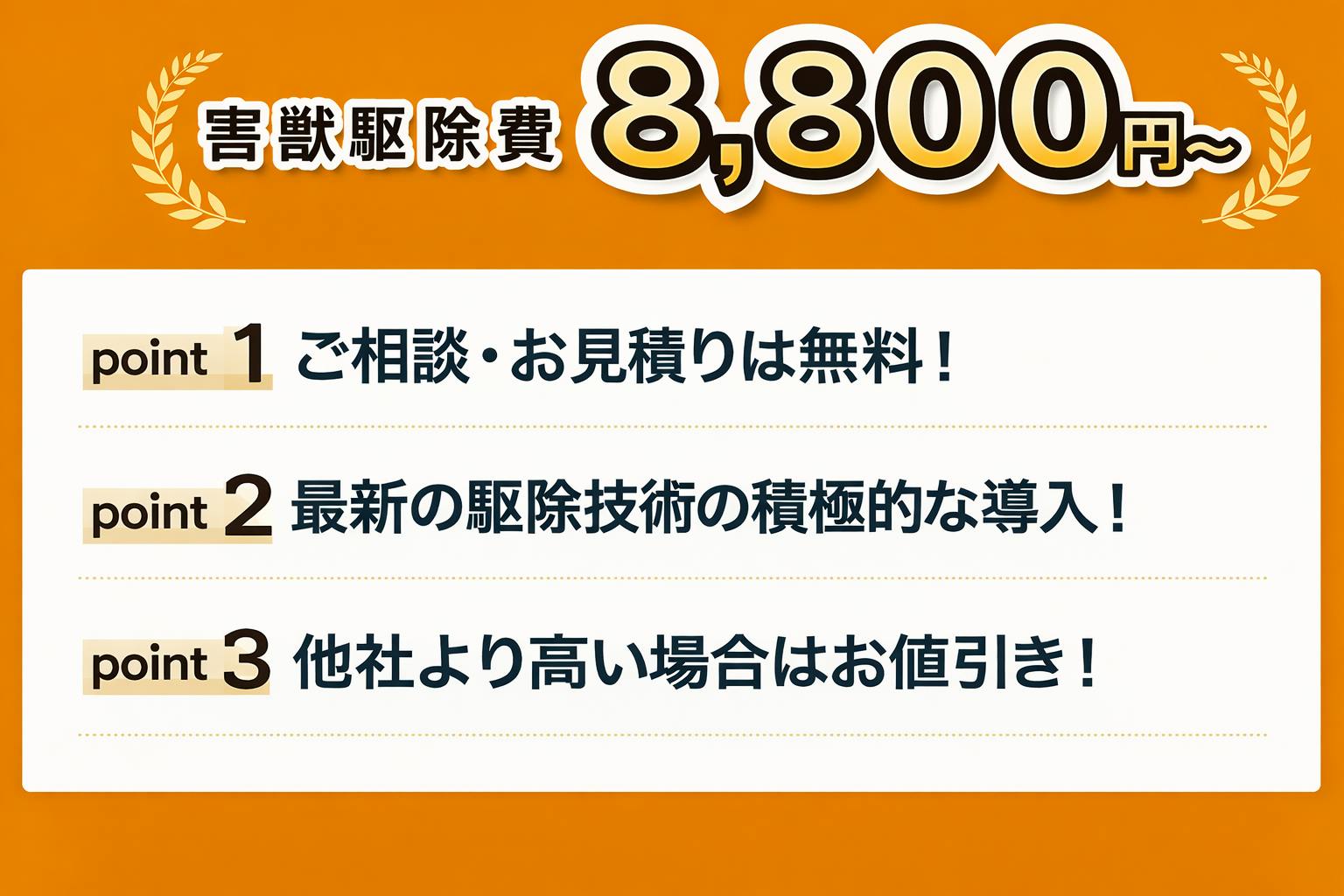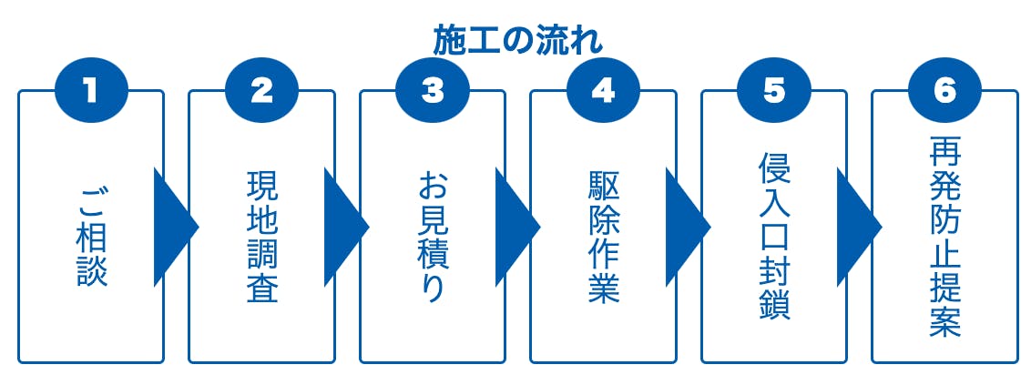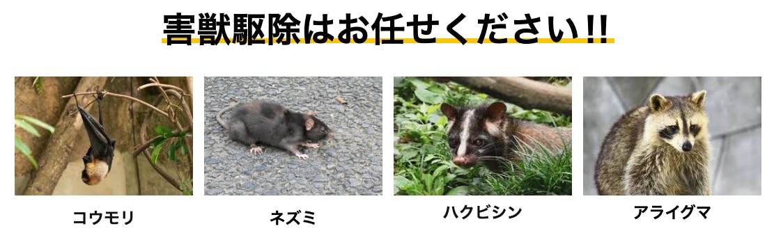 害獣駆除の費用は、建物の構造・被害状況・害獣の種類によって異なるため、一律料金ではなく現地状況に応じたお見積りとなります。